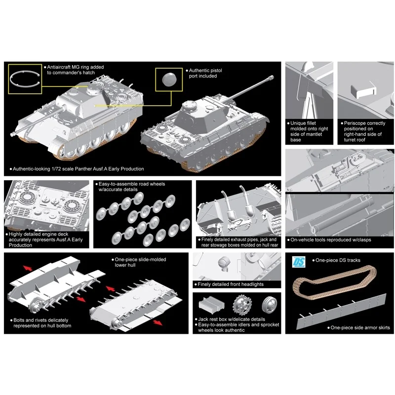 Dragon has previously produced 1/72 scale kits of early and late variants of the preceding Panther Ausf.D, and new to the range is this Panther Ausf.A Early-Production tank. Chronologically it follows on from the previous releases, giving modelers a new Panther variant to build. The turret is correctly suited to an Early-Production vehicle, possessing a periscope on the right side of the turret roof, plus a requisite fillet molded onto the side of the mantlet base. The upper hull is made as a single piece thanks to the clever use of slide molds. The lower hull tub has been formed the same way, thus ensuring a stable foundation for the rest of the build. All the appropriate characteristics of this Ausf.A Early-Production variant are present, and convenient DS tracks are provided too. Dragon’s delightful 1/72 scale Panther A definitely receives an ‘A’ grade!
