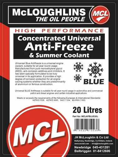 Description : Universal Blue Antifreeze is a universal engine coolant, suitable for all year round usage. Manufactured from pure monoethylene glycol (MEG), anti-corrosion additives and inhibitors. It has been specially formulated to be truly universal in its application. It provides a high degree of corrosion protection for all engine cooling systems whether they are predominantly of aluminium or ferrous construction. |