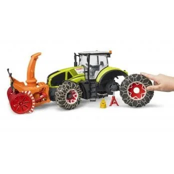 Prepared for winter! The redeveloped Axion 950 boasts comprehensive innovations in function, controls and output. In combination with the new BRUDER snow chains for that extra grip on ice and snow and the installed, height-adjustable snow blower, clearing even large amounts of snow from the roads becomes child’s play. The driver’s cab is fully glazed and doors as well as the bonnet open to lend that realistic feeling when playing. Thanks to the steering wheel extension the tractor is easy to steer from the outside and the adjustable milling drum including adjustable discharge mean even large amounts of snow can be dealt with easily. The vehicle is compatible with all Professional series trailers thanks to the adjustable rear coupling.