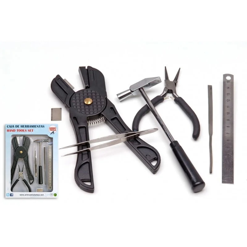 In the box you will find a hand pliers to bend strips that make easier the bending of wood, with spare blade, tweezers, hammer with metal head, flat rasp, ruler and round nose pliers.