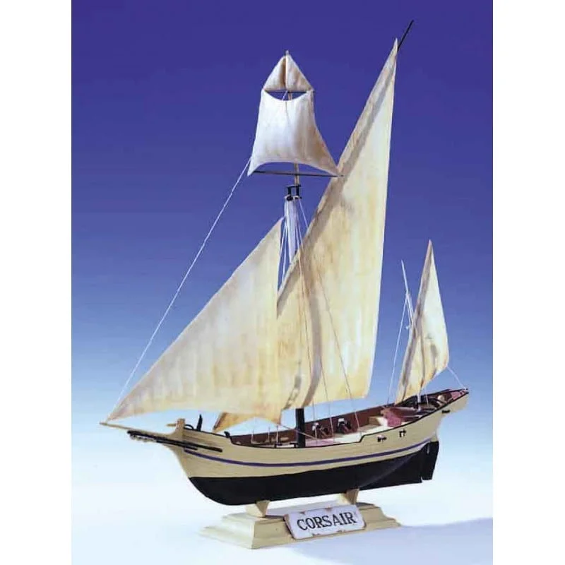 The CORSAIR is a tartane-class ship used by the army in times of war at the start of the XIXth century.  The term tartane (or tartan), of unknown origin, entered into everyday language in the XVIIth century, referring to a fishing vessel trading in the Mediterranean. Small, quick, discreet and easy to manoeuvre, the tartane stood a better chance of going unnoticed when commandeering other vessels, carrying out reconnaissance missions or delivering messages, more by surprise than by force. She figures among certain eras as part of the Navy, as an escort vessel or a surveillance ship, or even as a Corsair in the strategy known as “Guerre de Course”, in particular during the Revolution and the First French Empire. It’s hull had no real fineness, revealing its origin as a cargo vessel, but its rear overhanging deck and it’s prow, with well crafted naval ram, refine its outline. To the lateen of the original tartane, the mainsail (a triangular sail mounted on a large yard) and the polacca (the foresail tacked on the bowsprit), was added a topsail above the main mast, and a driver yard. The mainsail was sometimes replaced in heavy weather conditions by a square sail. The battleship was armed with four canons and of four to six blunderbusses. As a trading vessel, this type of boat that practised coastal shipping disappeared towards the middle of the XXth century with the development of road and rail transport. Today there’s only one tartane, rigged fore-and-aft, that still sails: “La Flâneuse”, which is attached to the port of Prado in Marseille, France.