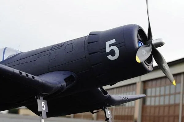 Dynam RC recreated this American Military Aviation marvel with its newest F4U Corsair. The plane is constructed of durable EPO foam. The wings span 1270mm and the fuselage length is approx 1066mm. The overall wing loading boasts 50g/dm2. The retractable rotating landing gears tuck away in the wings to provide awesome aerodynamic performance. The large prop is being thrown by a BM3720-KV500 Brushless Outrunner motor supported by a Detrum 40A ESC. Control surfaces are handled by four 9gram detrum servos for precise movement. A steerable tail wheel allows the pilot to taxi around the runway. Powering all these electronics is a 14.8v 2200mah Li-Po Battery. The blue paint scheme is vivid and stays true to the F4U scheme. A scale pilot in the cockpit finishes off this beautiful Dynam F4U Corsair.