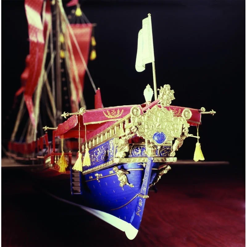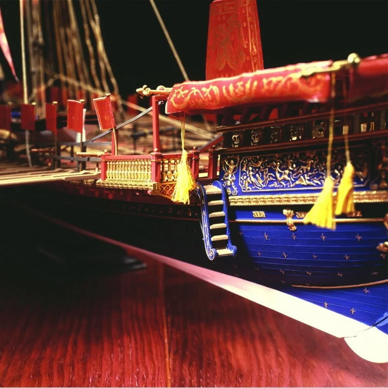 The proposed Réale is a restoration of the Réale which dates from the end of the XVIIth century. The sculptures which decorate it can be attributed to Pierre Piget, the well-known sculptor. According to the historical documents used for this construction, the hull of this galley measured approximately 170 feet long and 21 feet wide. It had 31 pairs of benches, one of which had been replaced on the port side with a kitchen. There were 7 men per bench, which indicates that there were at least 427 galley slaves. The Réale had two lateen sails, la Misaine and le petit Trinquet, for navigation. It would in fact be mistaken to believe that galleys navigated only by means of oars. The galley slaves were easily fatigued and the galleys navigated by sails during the journeys. Moreover, they travelled quite well using this means of propulsion. The oars were used during combat and manoeuvres.