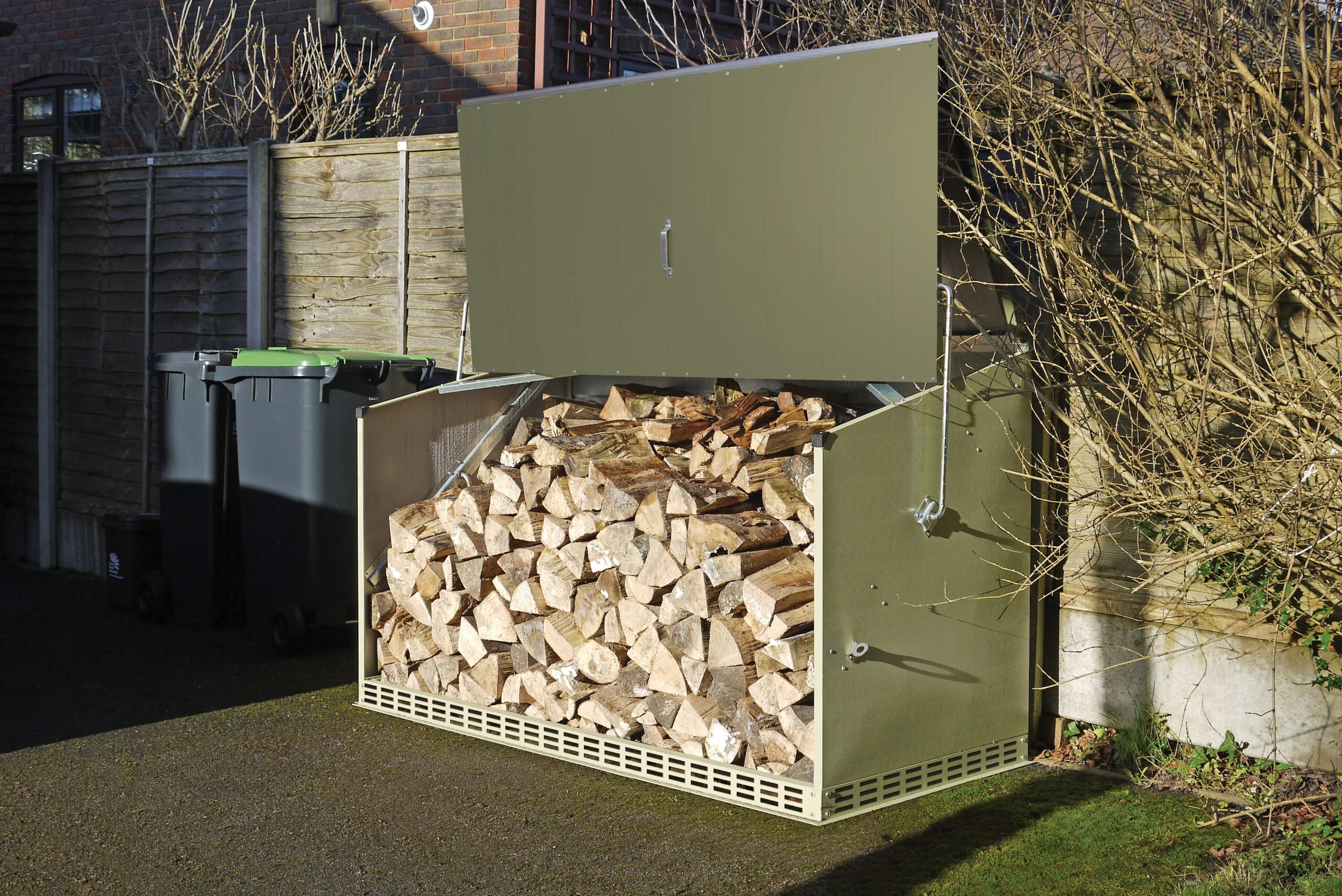 A secure, weatherproof metal log storage box with ventilation and a solid base—designed to keep firewood dry, tidy, and protected in any season.