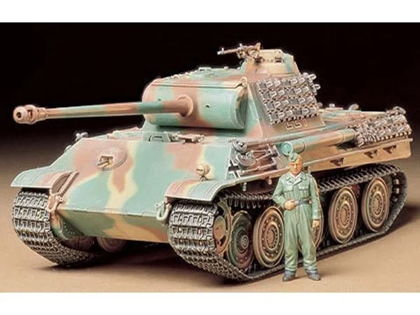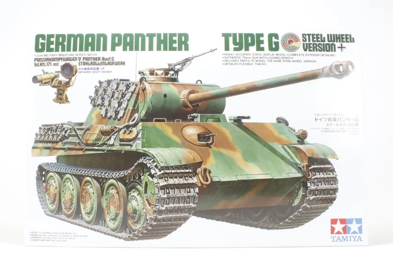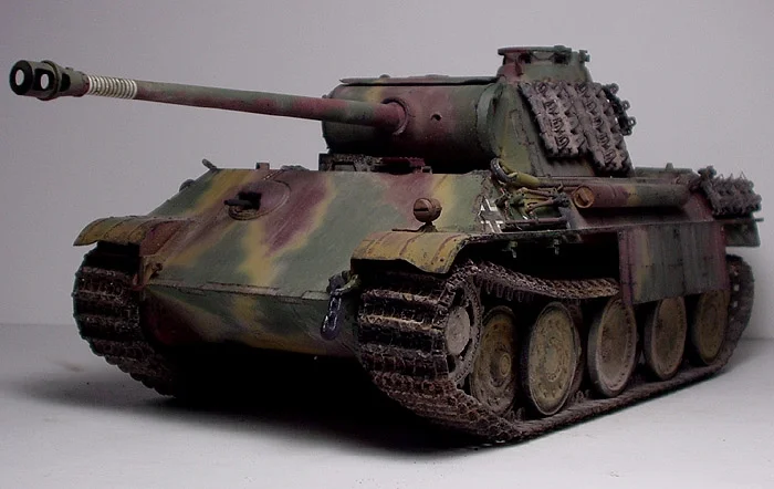 Because of its many advanced and innovative features, the World War II German Panzerkampfwagen V, known as the “Panther” tank, is still considered by many ordnance experts as a weaponry masterpiece. The development of the Panther came about due to the successes generated by the Russian T-34, which has become a serious threat to the German forces during the mid part of the conflict. Mass production of the Panther began during the spring of 1943, and with its sophisticated mechanics and powerful Type 42 L70, 70mm main gun, the Panther tank demonstrated its formidable strength during front line action shortly after its introduction. Several improvements were suggested following its initial employment, resulting in the Panther Type G, which began to appear in spring 1944. Major improvements consisted of additional side armor slope angles and simplified assembly refinements for mass production. The powerplant of the Type G Panther was a Maybach HL230-P30, V12 cylinder, watercooled engine producing 700 horsepower. In order to further enhance productivity and compensate for the lack of raw materials, a handful of trial production Panthers were mounted with steelwheels for testing pruposes. These were steel rimmed wheels replacing the conventional rubber rims, and were insulated from the hubs by two rubber rings clamped between disc-shaped pressings. The steel-wheeled Panther Type G’s were very rarely seen during combat.