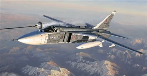 The Sukhoi Su-24 is a supersonic, all-weather attack aircraft developed in the Soviet Union. The aircraft has a variable-sweep wing, twin-engines and a side-by-side seating arrangement for its two crew. It was the first of the USSR’s aircraft to carry an integrated digital navigation/attack system. It remains in service with the Russian Air Force, Ukrainian Air Force, and various air forces to which it was exported.