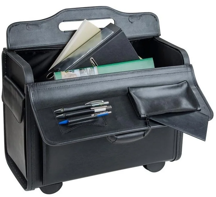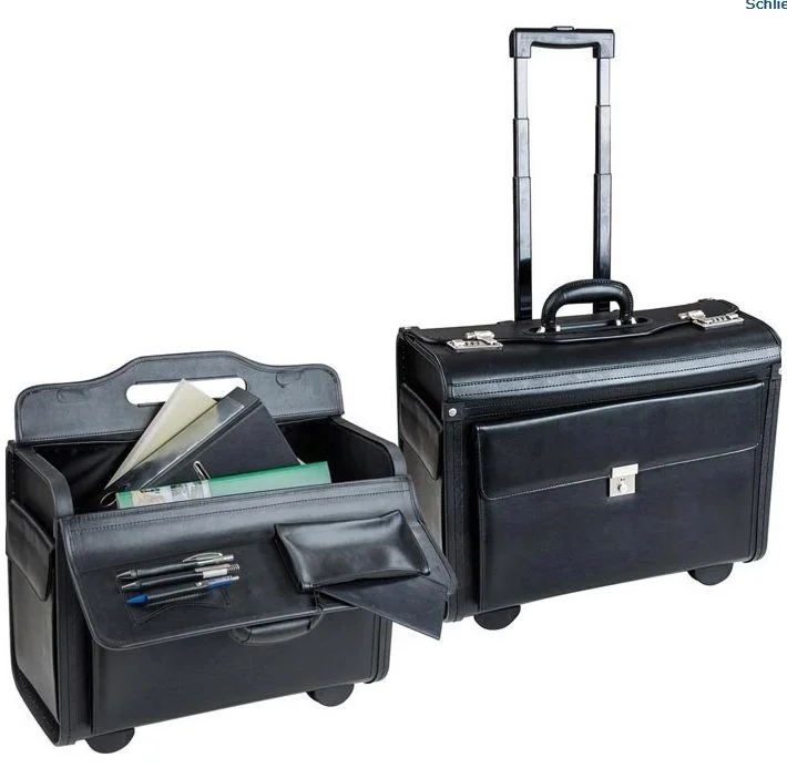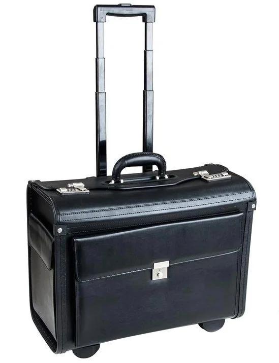 The stylish pilot case in the form of a trolley provides a convenient front pocket with lock.