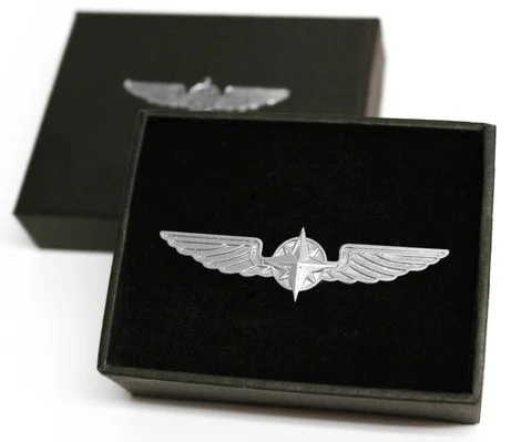 Very nice and subdued pilot pin made in metal, inclusive nice gift box.