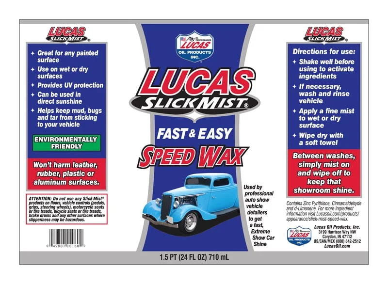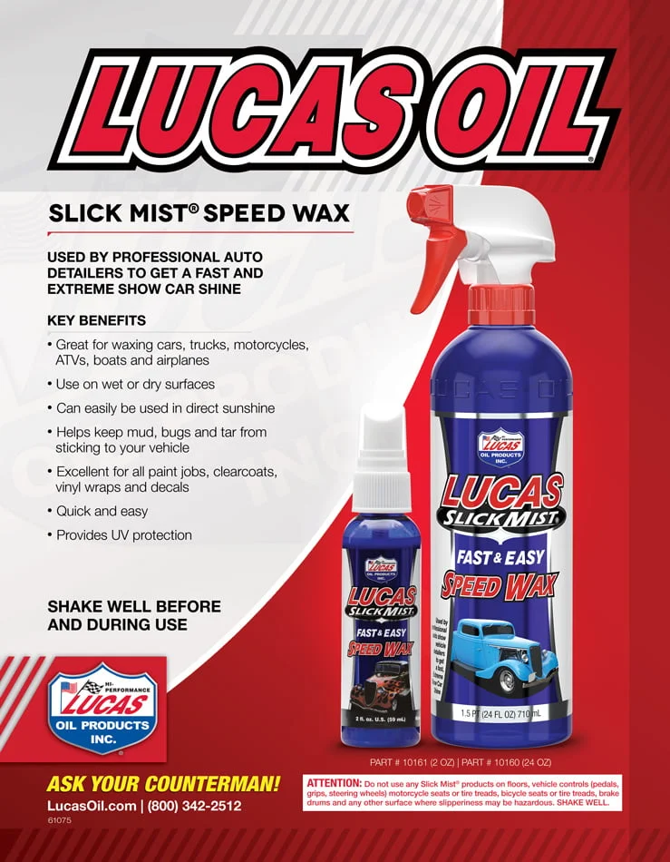 Lucas Oil Slick Mist is a polymer paint gloss intensifier, which can be used on other surfaces such as glass, chrome and vinyl decals. Use Slick Mist as a traditional wax, quick detail spray or spray it on your vehicle between rinsing and drying for the easiest polish job ever. That’s right! Just spray it on a wet or dry surface and wipe it off. Slick Mist out performs the competition and will leave your finish slicker and shinier than any product on the market, with long lasting protection. You and Slick Mist can give any machine an extreme gloss fast!