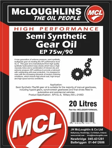 Semi Synthetic 75w/90 gear oil is suitable for the majority of manual gearboxes, including hypoid gears, synchromesh gearboxes and final drives fitted to automotive and commercial vehicles